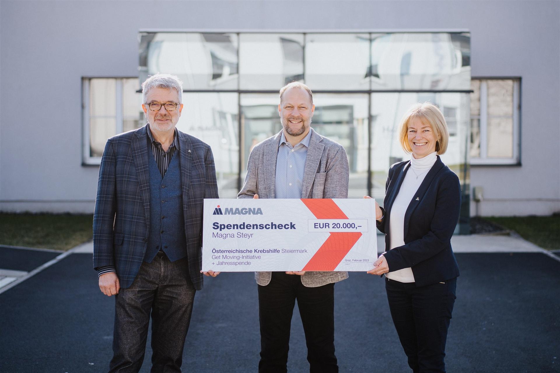 Seit 2014 unterstützt MAGNA STEYR die Arbeit der Krebshilfe Steiermark mit einem jährlichen Spendenscheck in der Höhe von 10.000 Euro. 2022 durften wir uns sogar über eine Spende von 20.000 Euro freuen.