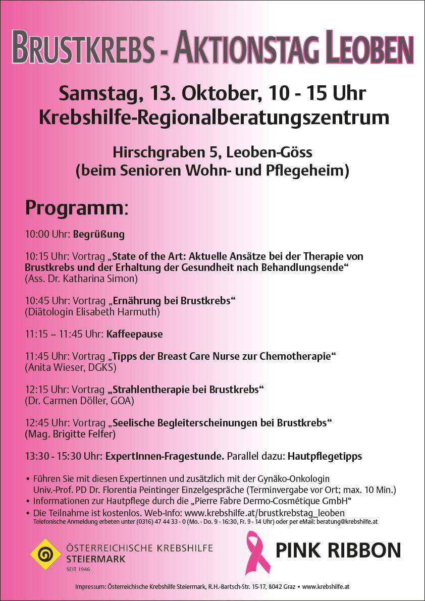 Detailinformationen zur Veranstaltung entnehmen Sie bitte der Internetseite www.krebshilfe.at/brustkrebstag_leoben