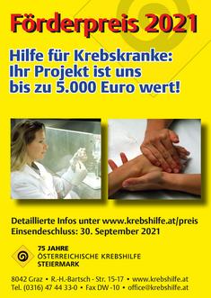 "Hilfe für Krebskranke in Beratung, Betreuung, Diagnostik und Therapie" – so lautet auch heuer das Generalthema des „Krebshilfe-Förderpreises 2021", der sich als attraktive Auszeichnung von außerordentlichen Leistungen für krebserkrankte Personen in der Steiermark etabliert hat.