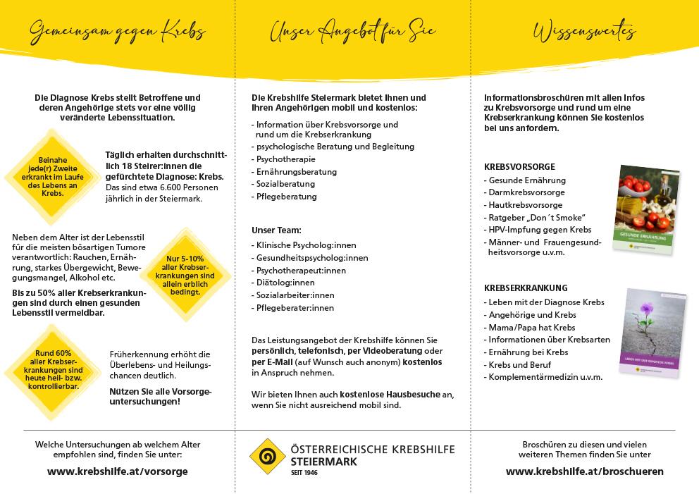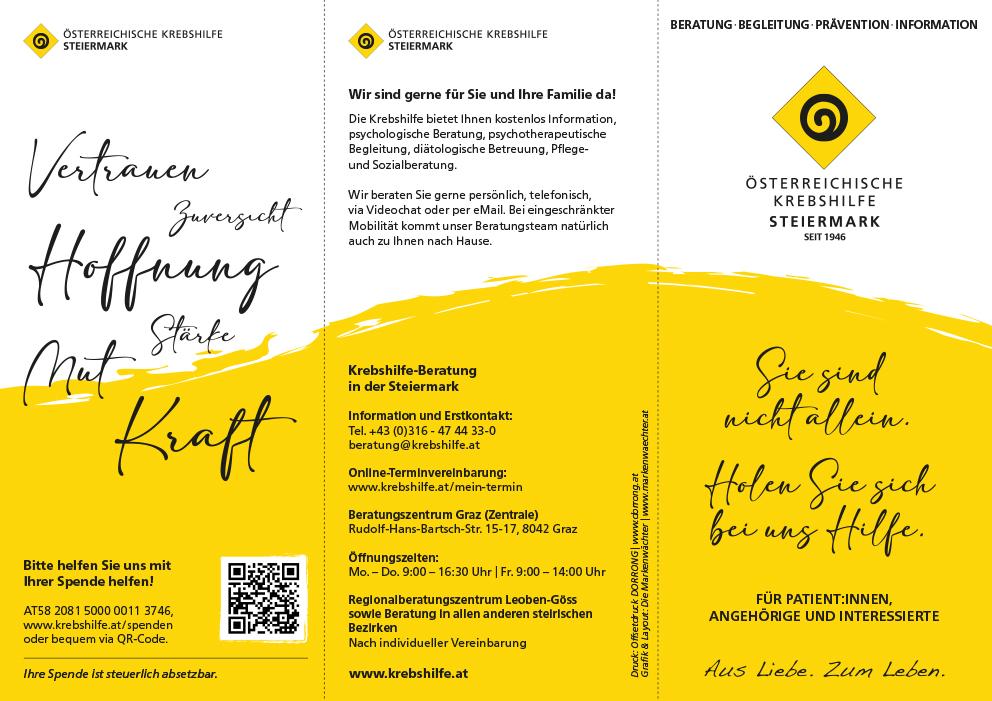 Diese Hilfe, Betreuung und Beratung bietet die Österreichische Krebshilfe seit mehr als 100 Jahren kostenlos an. Die Krebshilfe Steiermark war und ist der traditionsreichste Landesverein innerhalb der Konföderation der Österreichischen Krebshilfe und arbeitet seit 1946 - also bereits seit 70 Jahren - im Dienste unserer Bevölkerung. Bitte zögern Sie nicht und kontaktieren Sie uns, wir sind für Sie da, hören zu und helfen.