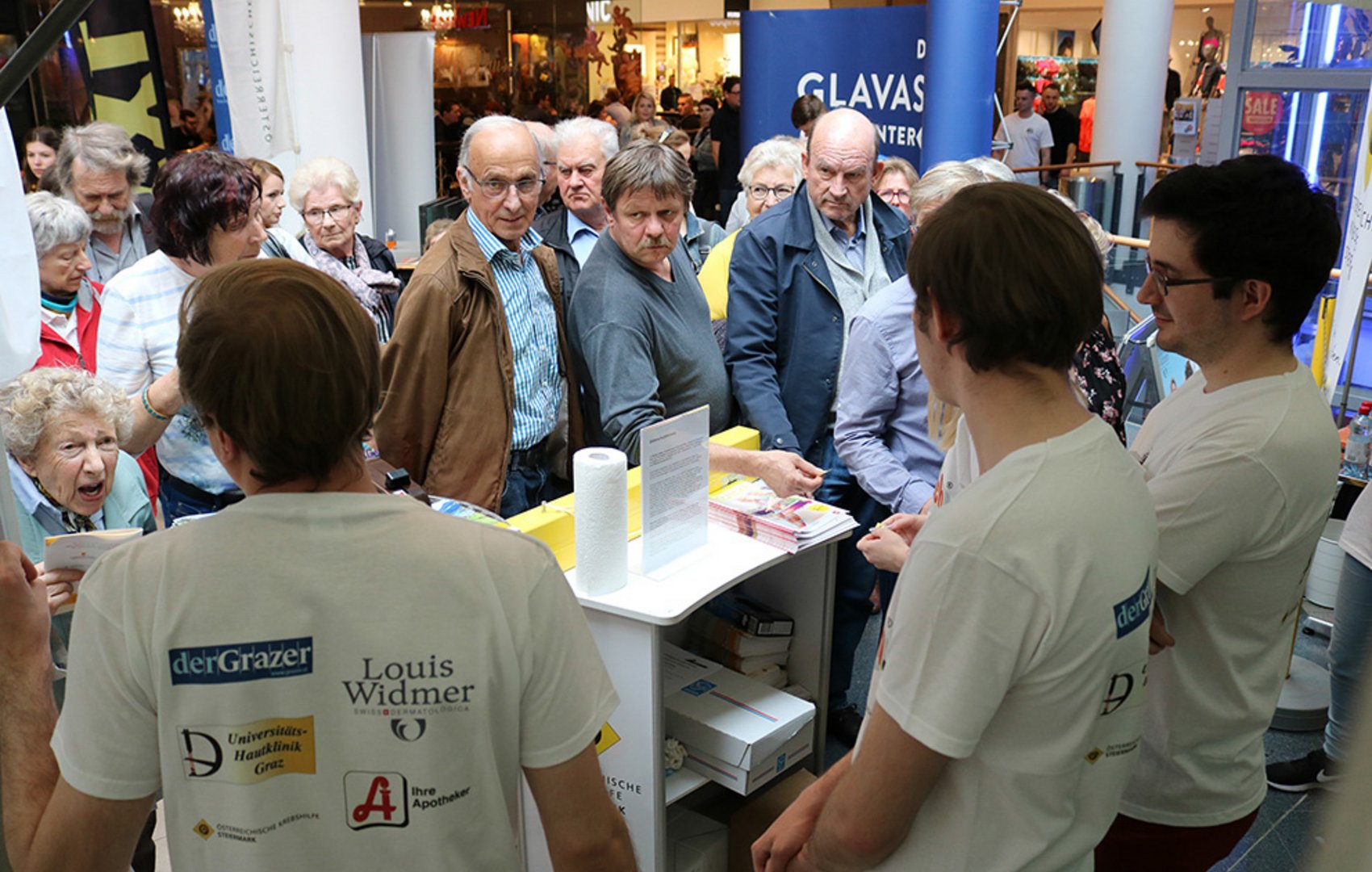 ExpertInnen der Universitäts-Hautklinik boten in vier diskreten Beratungs-Kojen wieder einen schnellen, aber gründlichen Haut-Check. Das Ergebnis: 217 Personen konnten untersucht werden. Darunter wurden 2 Maligne Melanome (der besonders gefährliche „Schwarze Hautkrebs“), 9 Basalzellkarzinome und 7 Plattenepithelkarzinome (beides fällt unter „Weißer Hautkrebs“) gefunden! Und unser langjähriger Partner „Louis Widmer Österreich“ belohnte alle Teilnehmerinnen und Teilnehmer mit einer Probe seiner hochwertigen Sonnenschutzprodukte.