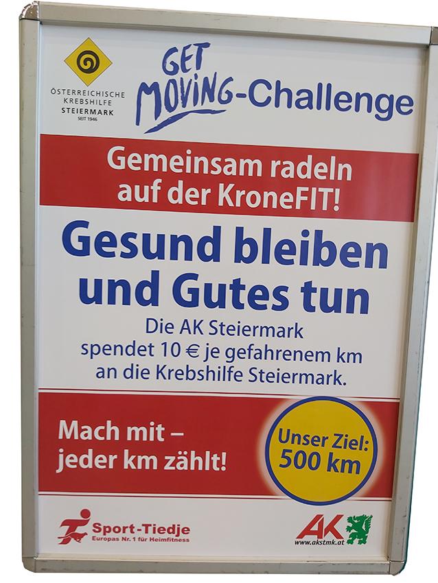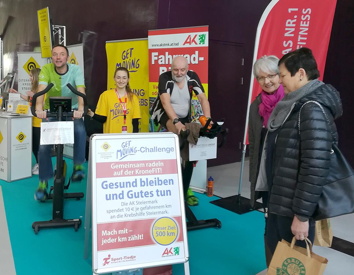 Auf der KroneFIT (7. und 8. Februar 2020, Messe Congress Graz) gab es heuer neben viel Information zum Thema Gesundheit und Vorsorge auch wieder eine ganz besondere Charity Aktion: Im Rahmen der Bewegungsaktion „GET MOVING!“ der Krebshilfe Steiermark hatten BesucherInnen am Stand der Krebshilfe wieder die Möglichkeit, ihrer Gesundheit etwas Gutes zu tun und gleichzeitig für den guten Zweck zu radeln.