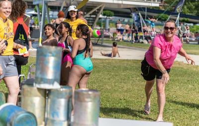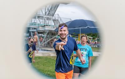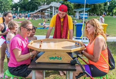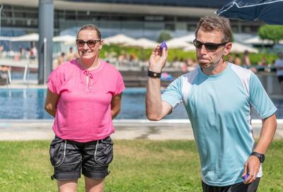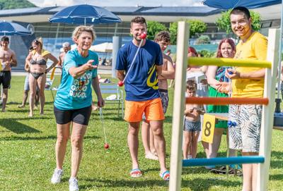 In Kooperation mit den Freizeitbetrieben der Holding Graz war es Sonntag, dem 27. Juni dann so weit: In fünf Teams, angeführt jeweils von einer prominenten steirischen Persönlichkeit, hatten die BesucherInnen der Auster bei verschiedenen Stationen die Möglichkeit, gegeneinander anzutreten und Punkte für ihr Team zu sammeln. Bei strahlendem Sonnenschein und durchaus herausfordernden Temperaturen zeigten dann nicht nur die BesucherInnen der Auster den ganzen Nachmittag lang großes Engagement, viel Begeisterung und Geschicklichkeit. Auch unsere Prominenten, Renate Götschl (Team ÖAMTC), Martin Kosch (Team AK Steiermark), Barbara Muhr (Team Steiermärkische Sparkasse), Robert Schauer und Sigrun Passelat (Team pure encapsulations/Pro Medico) und Thomas Seidl (Team FlipLab Graz) waren mit großem Engagement bei der Sache und hatten sichtlich Spass bei Disc Golf, Tischkegeln, waykick - oder dabei, sich im Gaberln zu messen. Bei zahlreichen Stationen zeigten sich dabei nicht nur ungeahnte Talente, es gab auch beeindruckende Leistungen zu bestaunen, wir etwa von Sigrun Passelat, die trotz ihrer vollständigen Beinamputation beim Sackhüpfen in Rekordzeit durchs Ziel ging.