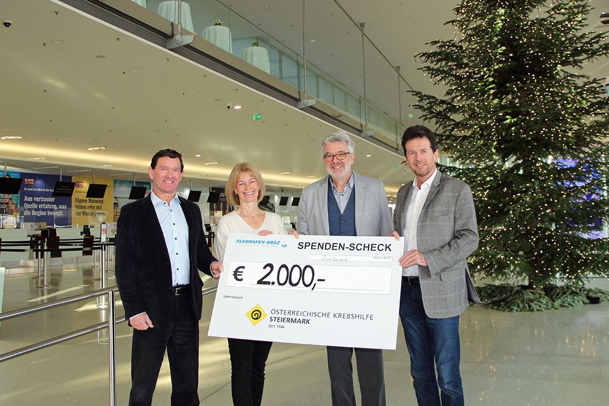 Traditionell wird am Flughafen Graz im Rahmen der Veranstaltung „Warten aufs Christkind“ um eine freiwillige Spende für eine gute Sache gebeten. In diesem Jahr wurde der gesammelte und vom Flughafen nochmals um € 2.000 aufgerundete Betrag, an die Österreichische Krebshilfe Steiermark übergeben.