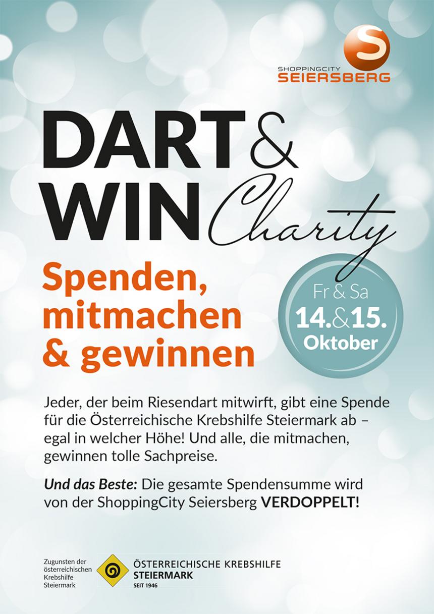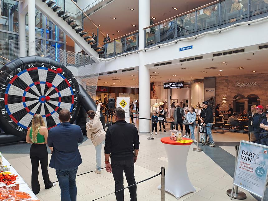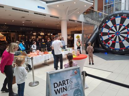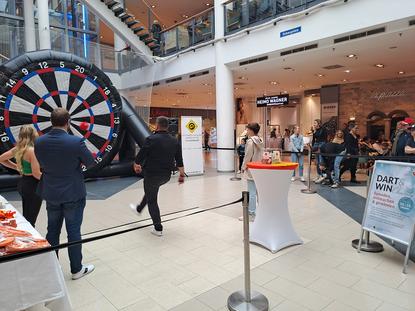Dart & Win hieß es heuer bereits zum zweiten Mal in der ShoppingCity Seiersberg. Auf einer riesigen Dartscheibe konnten BesucherInnen ihre Treffsicherheit unter Beweis stellen und gleichzeitig tolle Preise gewinnen. Es zeigte sich, dass die verschiedensten Wurf- und Schusstechniken dabei erfolgreich waren und im direkten Duell „Klein“ gegen „Groß“ oft die Kleinen die Nase vorne hatten.