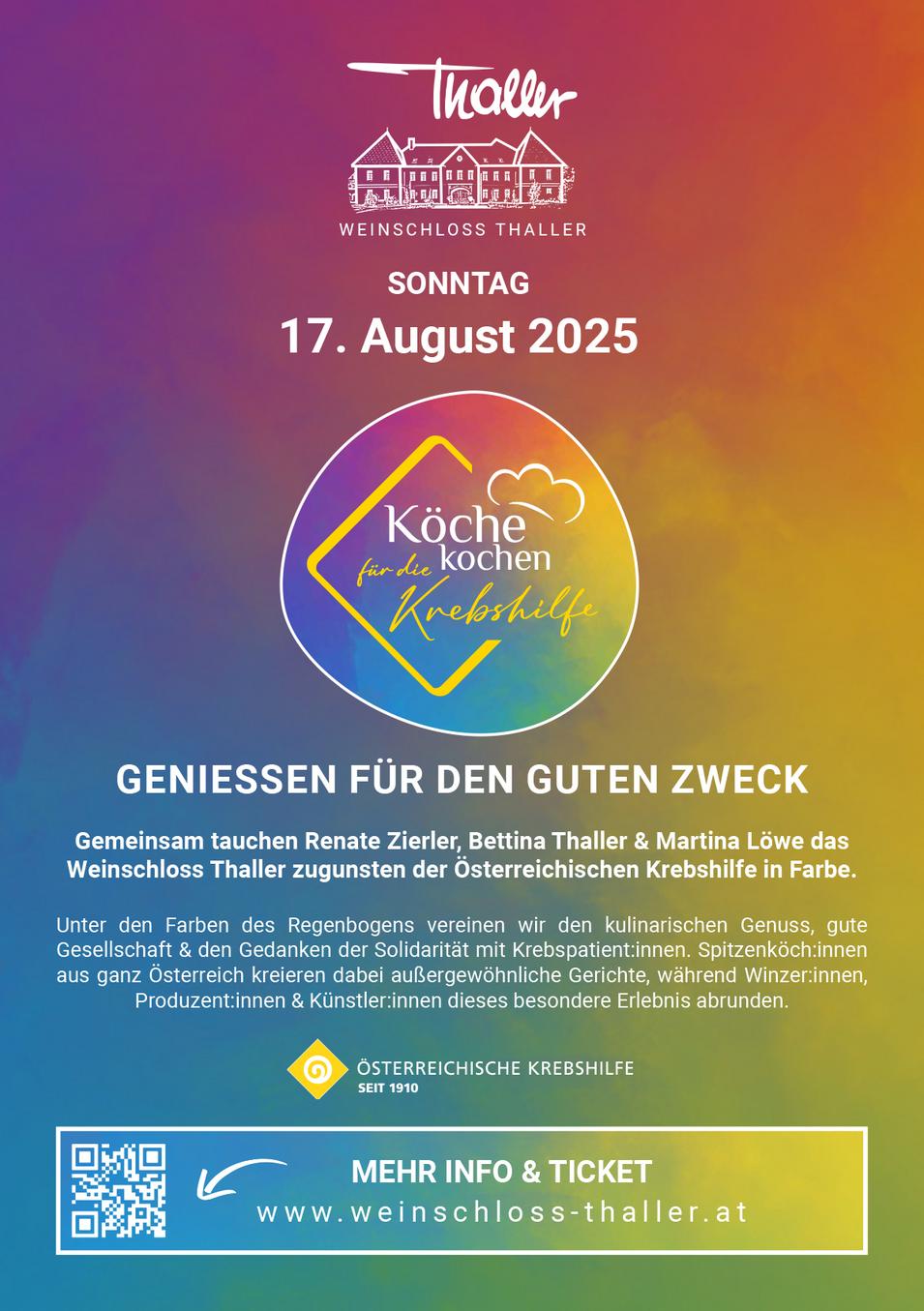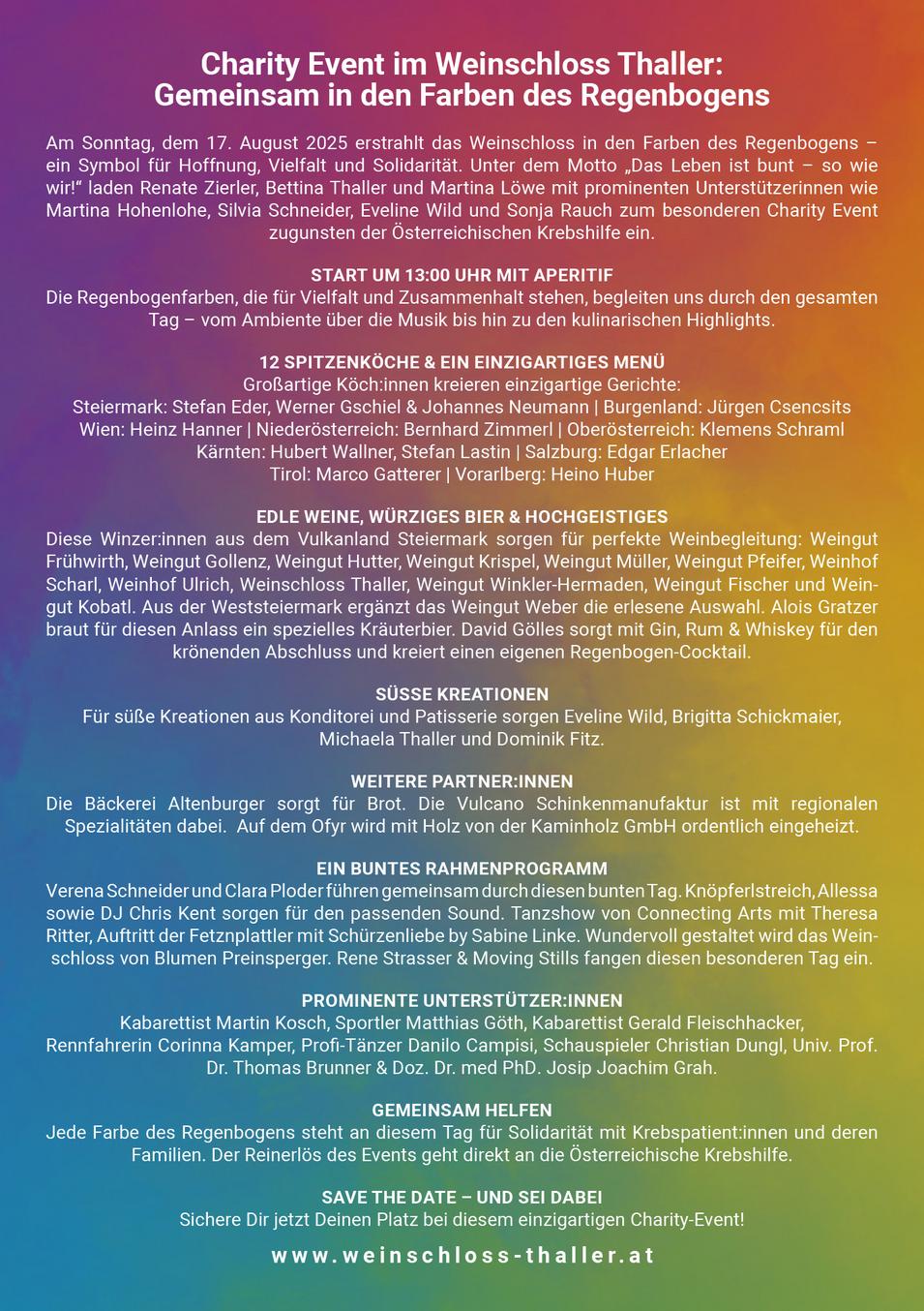Unter den Farben des Regenbogens vereinen wir den kulinarischen Genuss, gute Gesellschaft und den Gedanken der Solidarität mit Krebspatient:innen bei Köche kochen für die Krebshilfe im Weinschloss Thaller. Martina Hohenlohe, Silvia Schneider, Eveline Wild, Sonja Rauch unterstützen dabei mit Martina Löwe und Bettina Thaller als starke Patinnen die neue Aktion "Köche kochen" zugunsten der Österreichischen Krebshilfe von Renate Zierler.