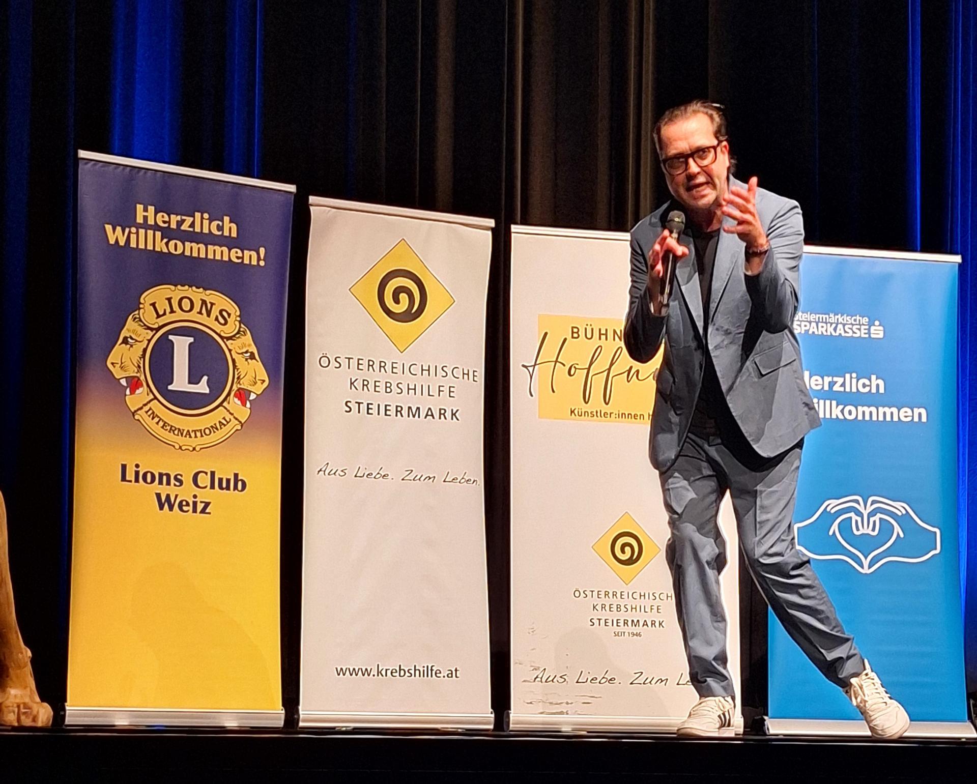 Am 12. November 2025 durften wir uns im Kunsthaus Weiz über einen ganz besonderen Abend freuen: Kabarettist Gerald Fleischhacker spielte sein aktuelles Programm „Lustig!“ – und das ehrenamtlich, zugunsten der Österreichischen Krebshilfe Steiermark und des Lions Club Weiz.