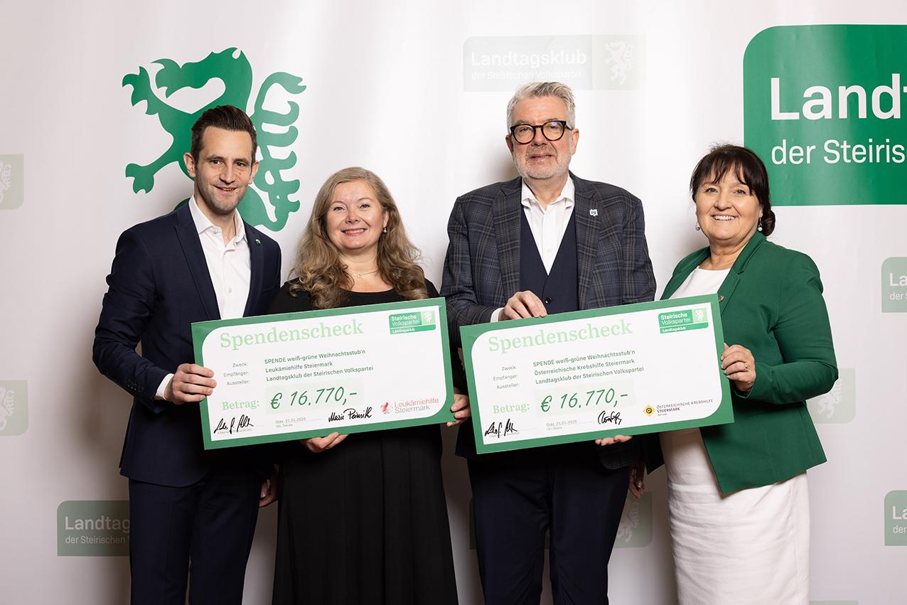 In der Vorweihnachtszeit stellten sich Funktionärinnen und Funktionäre sowie Mitarbeiterinnen und Mitarbeiter der Steirischen Volkspartei im Glühweinstand am Grazer Adventmarkt ins in den Dienst der guten Sache. Bei der „weiß-grünen Weihnachtsstub’n“ am Karmeliterplatz konnten wärmende Getränke sowie Christbaumschmuck in Form des steirischen Panthers für den guten Zweck erworben werden. Der dabei gesammelte Erlös kann sich sehen lassen. Am Dienstag, dem 21. Jänner 2025, konnten im Landtagsklub der Steirischen Volkspartei im Grazer Landhaus die geschäftsführende Landesparteiobfrau Manuela Khom und Klubobmann Lukas Schnitzer gemeinsam jeweils einen Scheck in der Höhe von 16.770,- Euro an die Österreichische Krebshilfe Steiermark und an die Leukämiehilfe Steiermark übergeben.