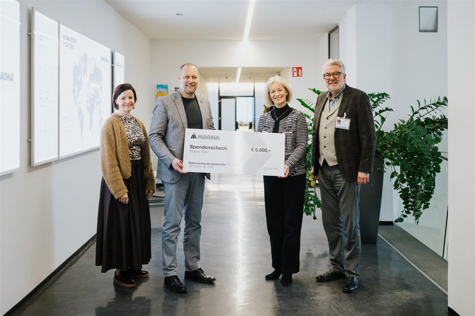 Magna Steyr zählt seit vielen Jahren zu den verlässlichsten und engagiertesten Partnern der Steirischen Krebshilfe. Insgesamt durften wir seit Beginn unserer Zusammenarbeit bereits 120.000 Euro entgegennehmen – Mittel, die direkt der Betreuung von krebserkrankten Menschen und deren Angehörigen zugutekommen und unsere Arbeit in der Steiermark nachhaltig ermöglichen.
